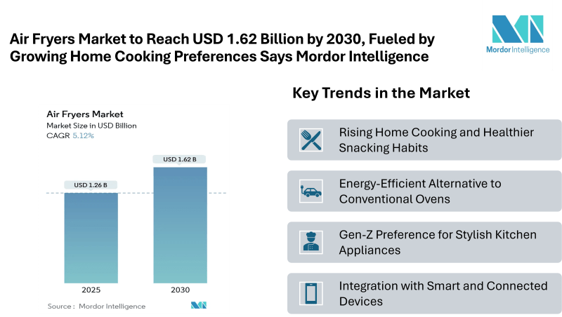 According to Mordor Intelligence, the global Air Fryers Market size stood at USD 1.26 billion in 2025 and is forecast to advance at a 5.12% CAGR, reaching USD 1.62 billion by 2030. The Air Fryers Market share is increasingly influenced by product innovations, including rapid-heat technology, PFAS-free coatings, and smart-home connectivity.