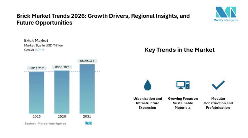 According to the Mordor Intelligence report, the brick market size is estimated at USD 1.78 trillion in 2026, growing from USD 1.73 trillion in 2025 and projected to reach USD 2.03 trillion by 2031. The market is expected to grow steadily as construction activity expands across developing and developed regions.
