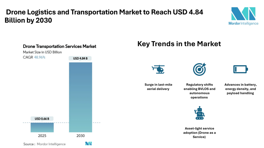 UAE Arabia > Press Releases > Drone Logistics and Transportation Market to Reach USD 4.84 Billion by 2030, Driven by Aerial Last-Mile Demand and Medical Corridors – Mordor Intelligence