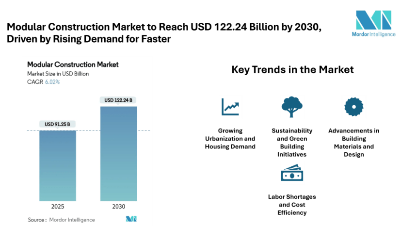 According to a Modular Construction Market report by Mordor Intelligence, the market size is projected to reach USD 122.24 Billion by 2030, growing at a CAGR of 6.02% during the forecast period (2025–2030). The increasing focus on reducing construction timelines, enhancing efficiency, and addressing labor shortages has led to the rising adoption of modular construction solutions worldwide.