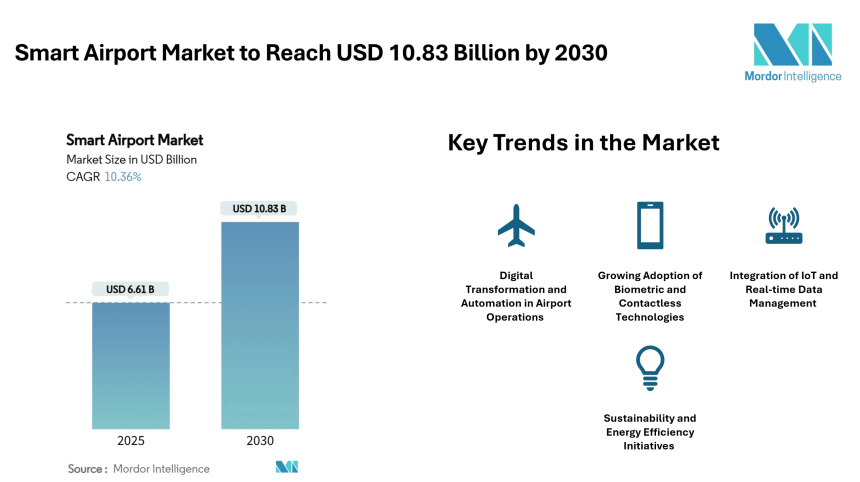 The smart airport market reached USD 6.61 billion in 2025 and is forecasted to reach USD 10.83 billion by 2030, advancing at a 10.36% CAGR. Growing passenger traffic, tighter security mandates, and the need for real-time operational visibility prompt airports to accelerate digital transformation. This growth is driven by the increasing emphasis on seamless passenger experience, operational efficiency, and the adoption of data-driven airport management systems. The demand for advanced airport solutions integrating IoT, AI, biometric verification, and automated systems is expanding across both developed and emerging regions.