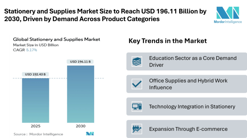 The stationery and supplies market continues to show resilience and adaptability, with demand supported by education, office needs, and evolving consumer preferences. According to industry analysis, the market size is estimated at USD 152.43 billion in 2025 and is projected to climb to USD 196.11 billion by 2030, reflecting a healthy CAGR of 5.17% during the forecast period. The stationery and supplies market growth is shaped by a combination of digital adoption, renewed emphasis on workplace essentials, and sustained interest in creative and design-focused products.